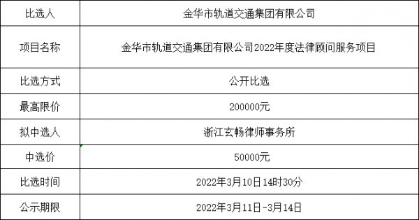 金華市軌道交通集團有限公司2022年度法律顧問服務項目中選公示