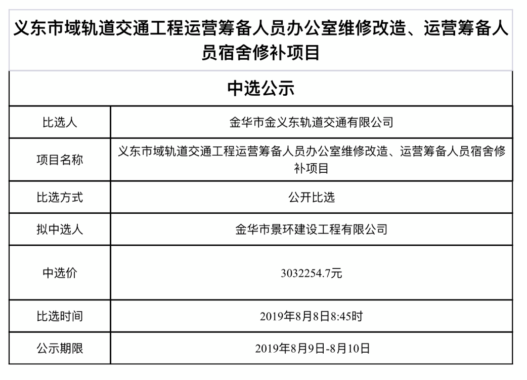 金華市金義東軌道交通有限公司運(yùn)營(yíng)2025年安全質(zhì)量活動(dòng)項(xiàng)目的中標(biāo)候選人公示