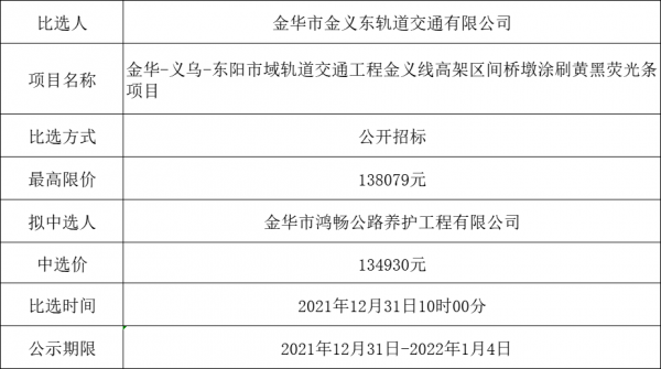金華-義烏-東陽市域軌道交通工程金義線高架區(qū)間橋墩涂刷黃黑熒光條項目中標(biāo)公示